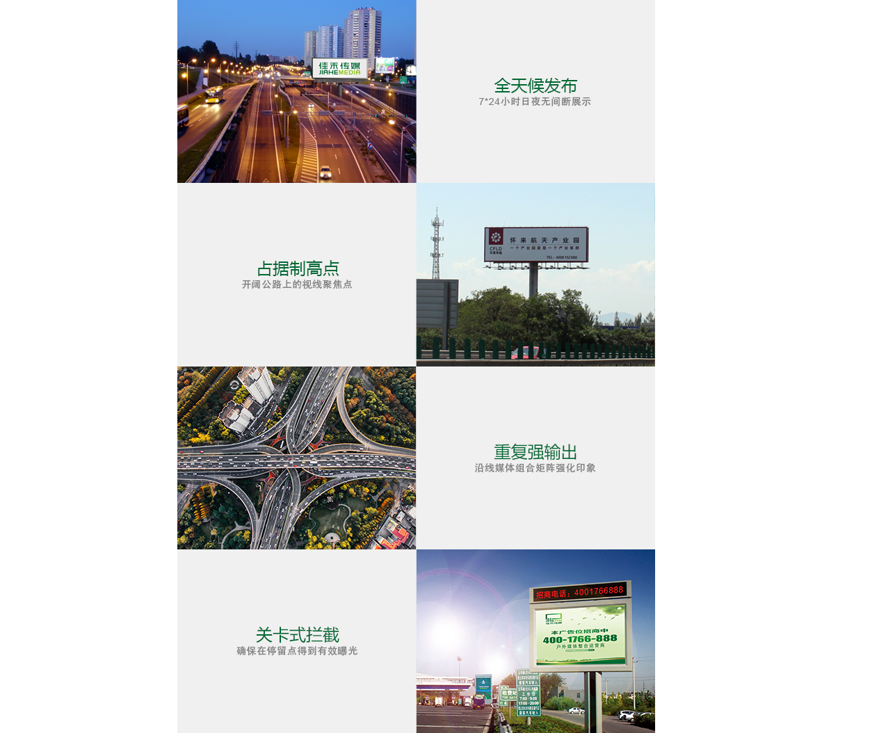 高速媒体辐射全国各大主要高速公路及环线,媒体包括单立柱、灯箱、收费站棚、跨线桥、LED屏等多种形式,